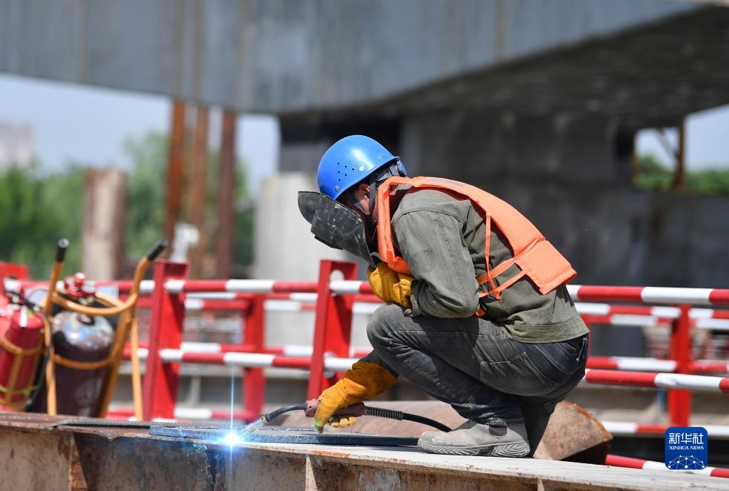 4月30日,在位于陜西省西安市國際港務(wù)區的水流路跨灞河大橋項目施工現場(chǎng),一名電焊工在進(jìn)行焊接作業(yè)。