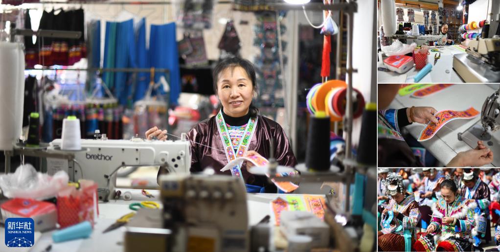 拼版照片:左圖為廣西融水苗族自治縣桿洞鄉桿洞村49歲的苗族服飾制作技藝傳承人楊洪英(2023年4月25日攝);右上、中圖為楊洪英在刺繡(2023年4月25日攝);右下圖為楊洪英在刺繡比賽中(2019年10月18日攝)。