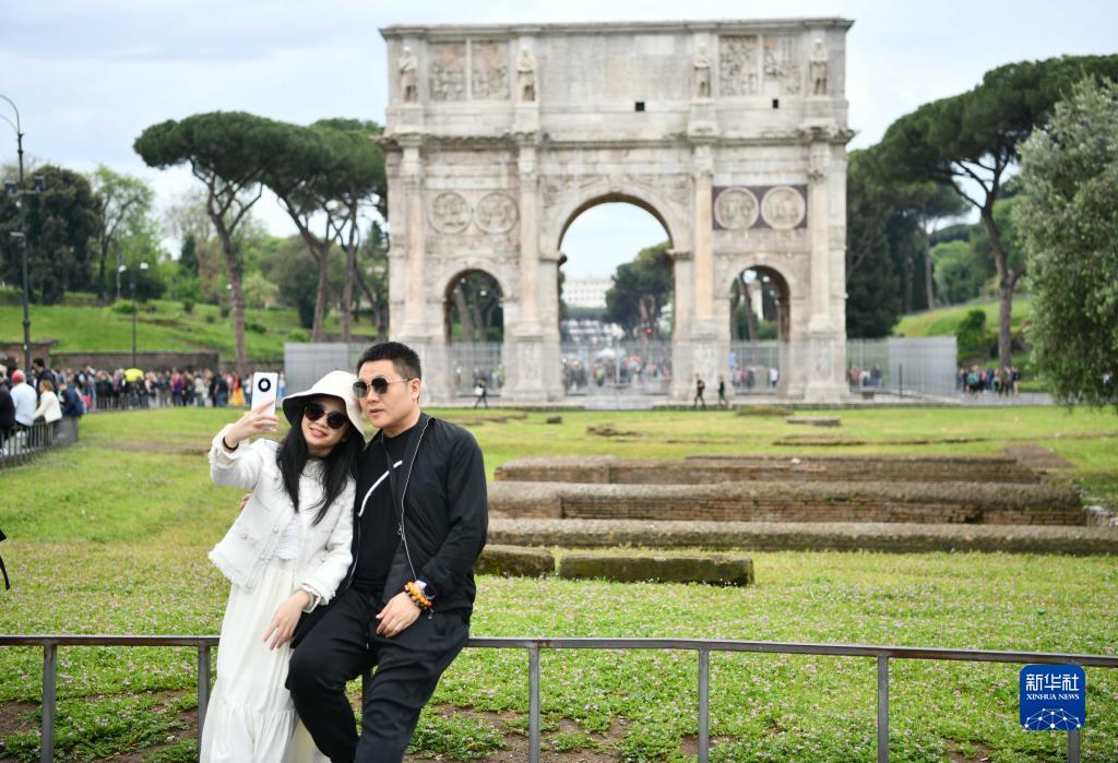 5月1日,中國游客在意大利羅馬君士坦丁凱旋門(mén)附近自拍。