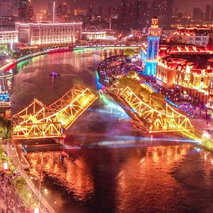 5月1日晚,位于天津海河上的標志性建筑物解放橋橋梁開(kāi)啟,橋梁開(kāi)啟角度達到最大角度60度。
