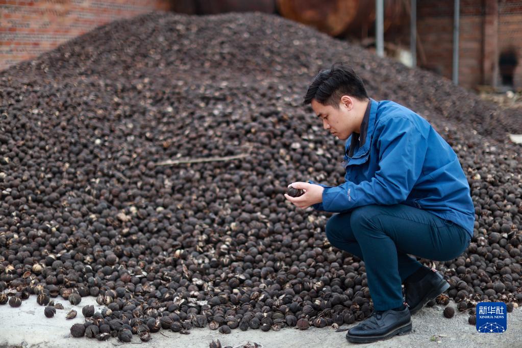 楊安仁檢查收獲的油桐果實(shí)(4月17日攝)。