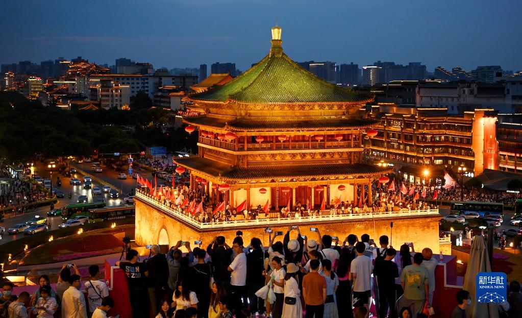 5月2日,在陜西西安,游客在觀(guān)景平臺欣賞鐘樓夜景。