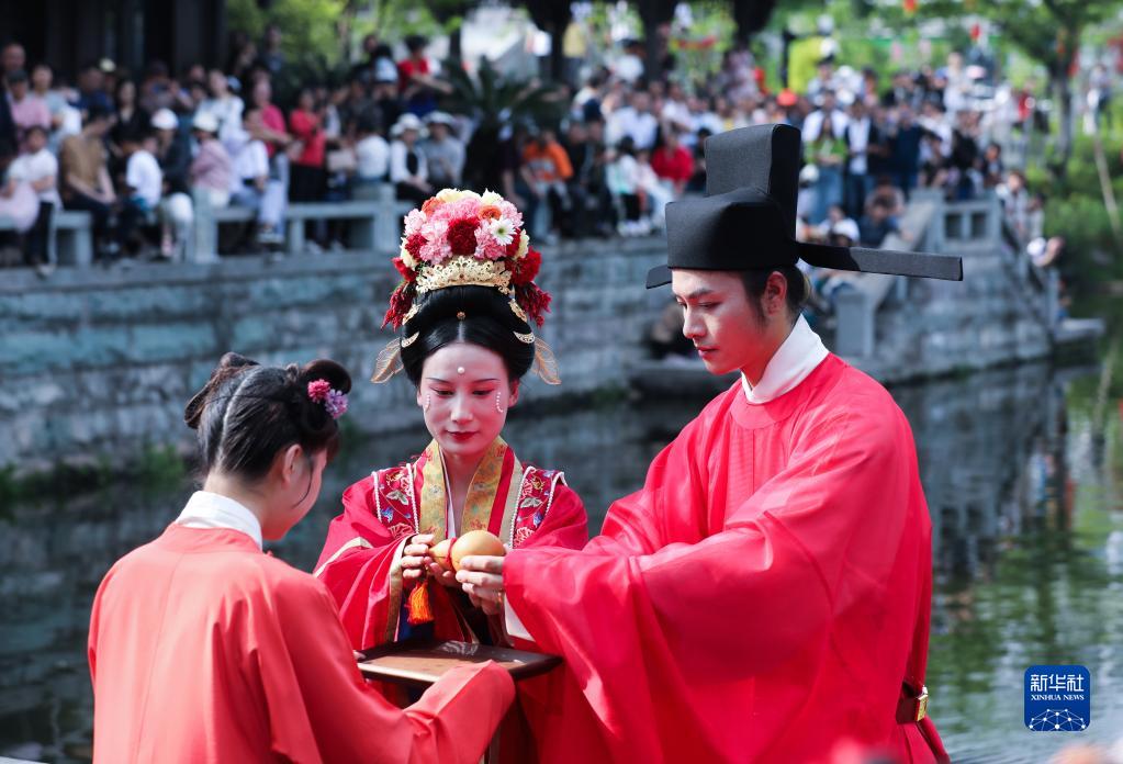 當日,浙江省建德市梅城鎮嚴州古城舉行宋韻水上婚禮表演,通過(guò)出閣、梳妝、登船、親迎、禮拜的五幕演繹,吸引了人們駐足觀(guān)禮。有著(zhù)1000多年歷史的嚴州古城地處新安江、富春江、蘭江交匯處,歷史文化積淀深厚。
