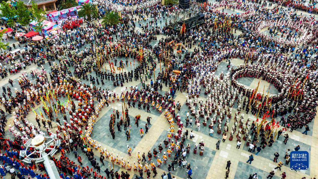 5月2日,人們在貴州省臺江縣姊妹廣場(chǎng)參加苗族姊妹節盛裝活動(dòng)(無(wú)人機照片)。