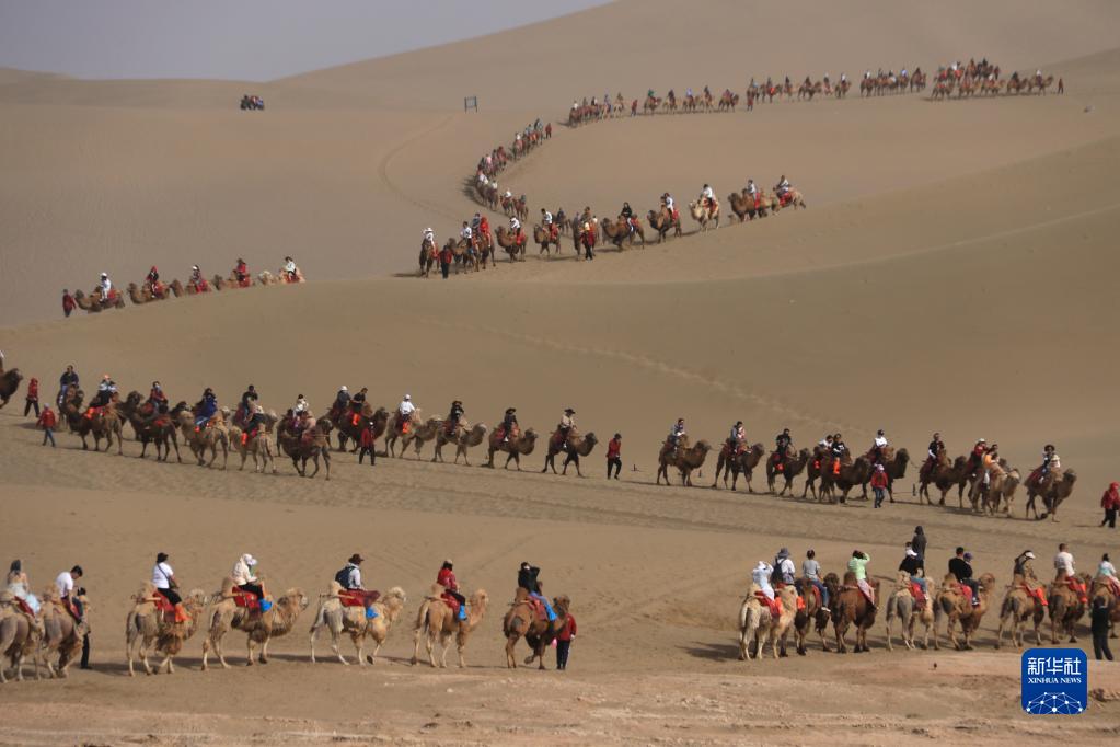 5月1日,游客在甘肅省敦煌市鳴沙山月牙泉景區游覽。