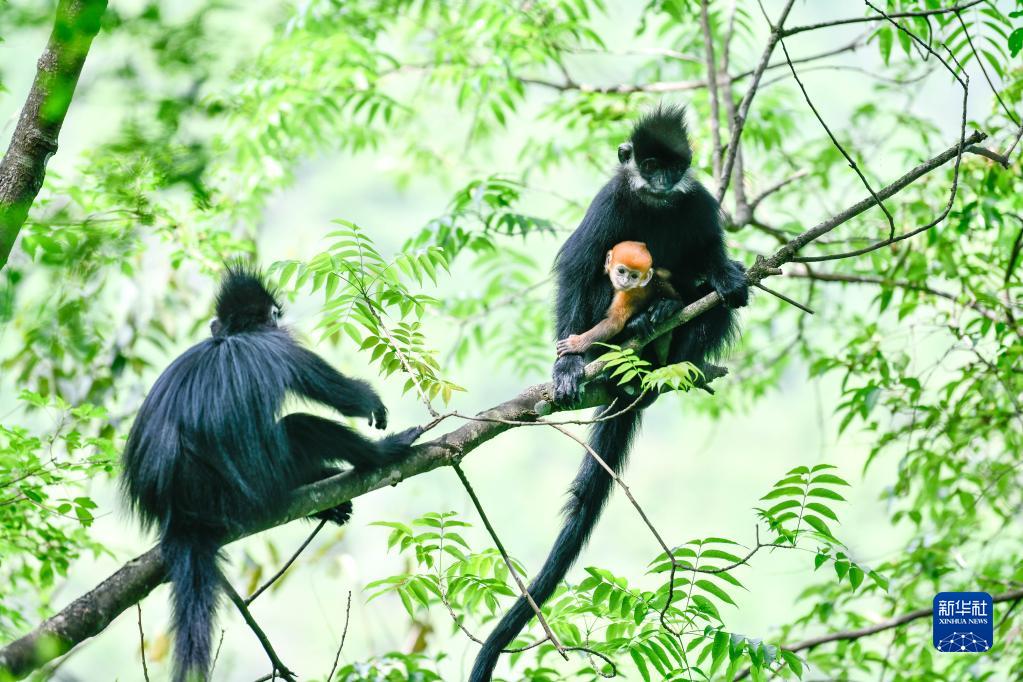 5月1日拍攝的貴州麻陽(yáng)河國家級自然保護區的黑葉猴及幼猴。