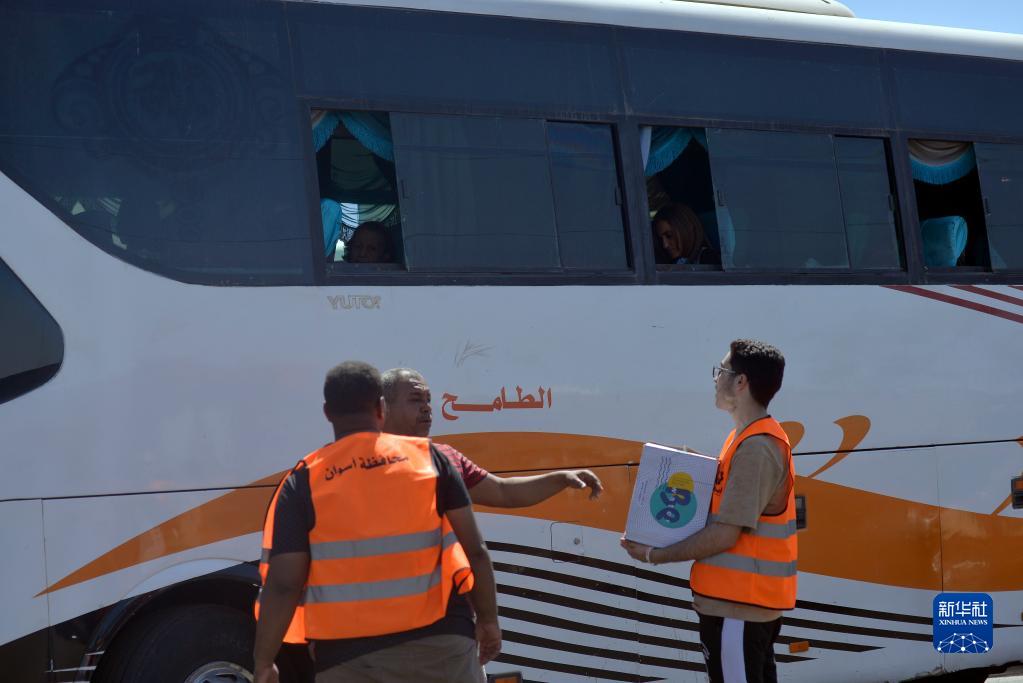5月2日,在埃及南部阿斯旺省的一處汽車(chē)站,一名工作人員為逃離蘇丹進(jìn)入埃及的難民發(fā)放水。
