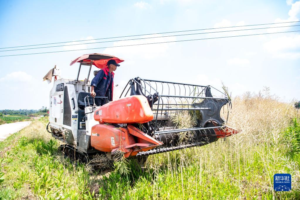 5月4日,在重慶市合川區龍市鎮現代農業(yè)產(chǎn)業(yè)園,農民操作農機收獲油菜籽。當地采用“油稻輪作”方式,利用冬閑田種植油菜,油菜收割后再種植水稻,以此增加當地農民收入。