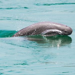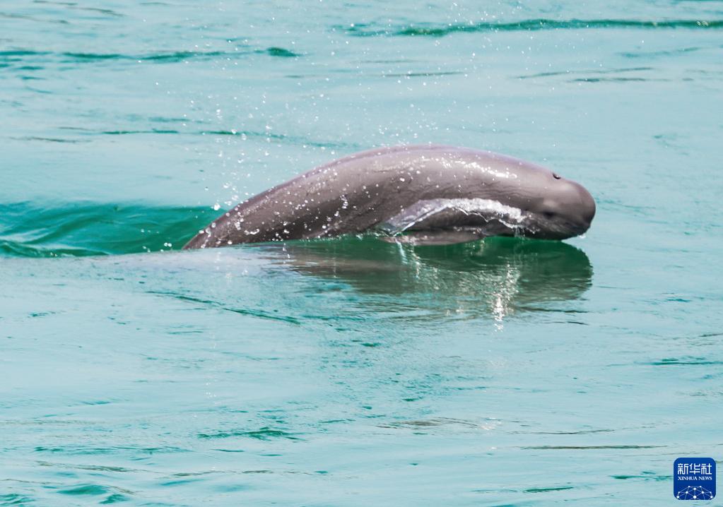 5月20日,江豚在湖北省宜昌市葛洲壩下游水域逐浪嬉戲。