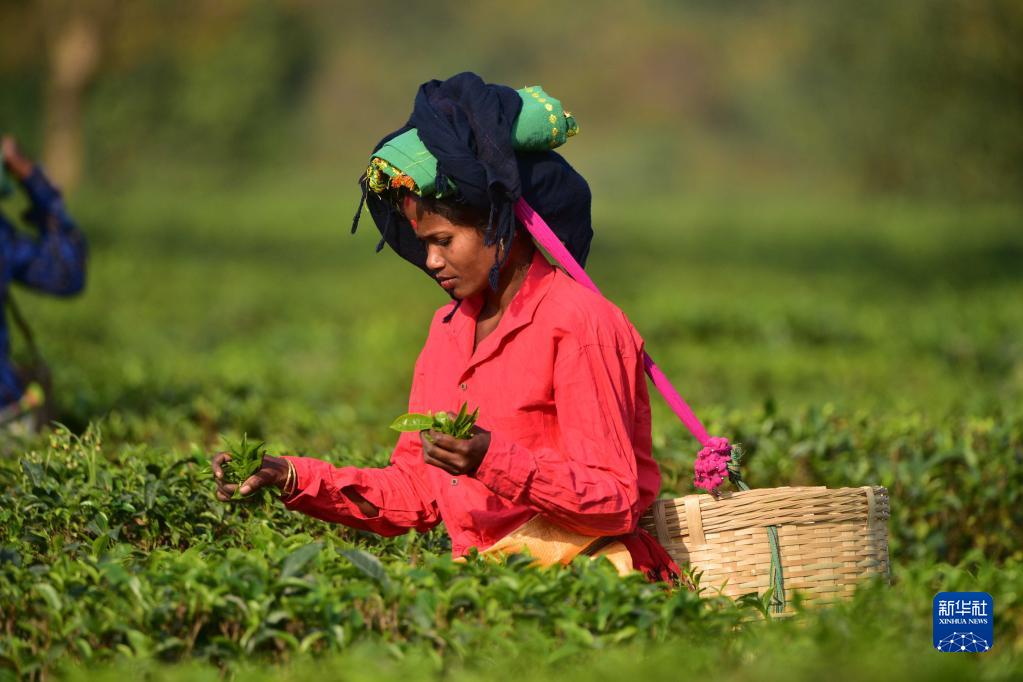 這是2023年3月14日,工人在印度阿薩姆邦納加奧恩地區的茶園里采摘茶葉。
