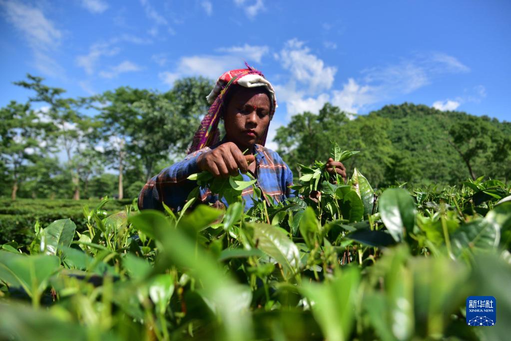 這是2022年8月24日,工人在印度阿薩姆邦納加奧恩地區的茶園里采摘茶葉。