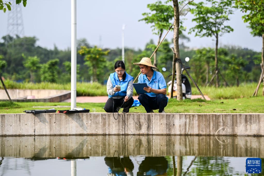 5月20日,技術(shù)人員在廣西大藤峽水利樞紐工程魚(yú)類(lèi)增殖放流站監測室外親魚(yú)池水質(zhì)。