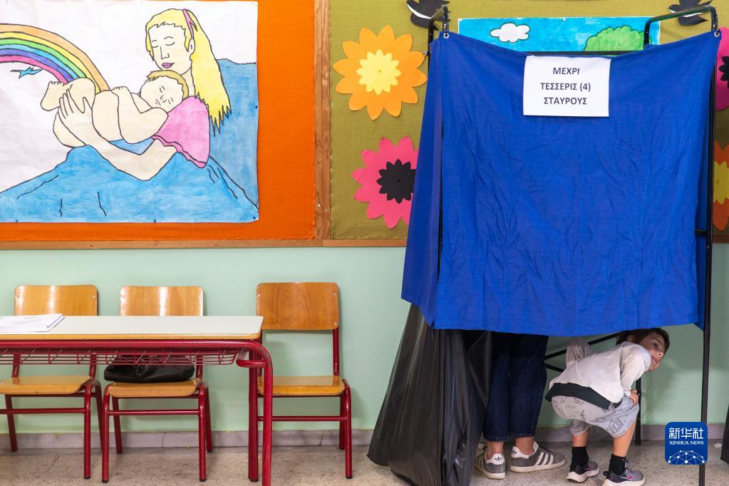 5月21日,一名選民帶著(zhù)孩子在希臘雅典一處投票站參加投票。