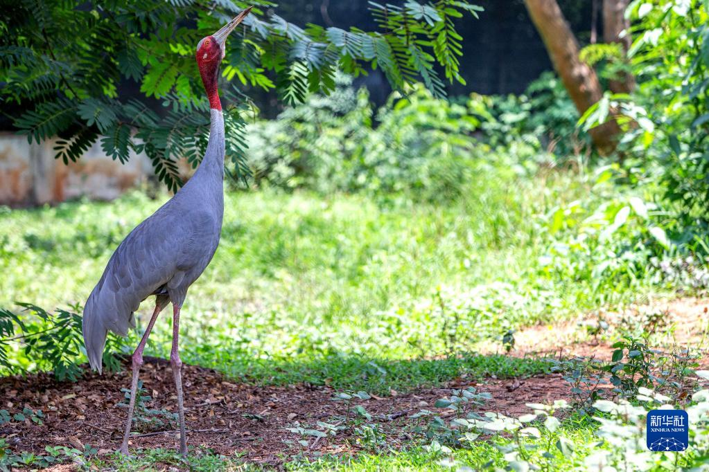 這是5月16日在泰國呵叻府動(dòng)物園赤頸鶴保育中心拍攝的赤頸鶴。