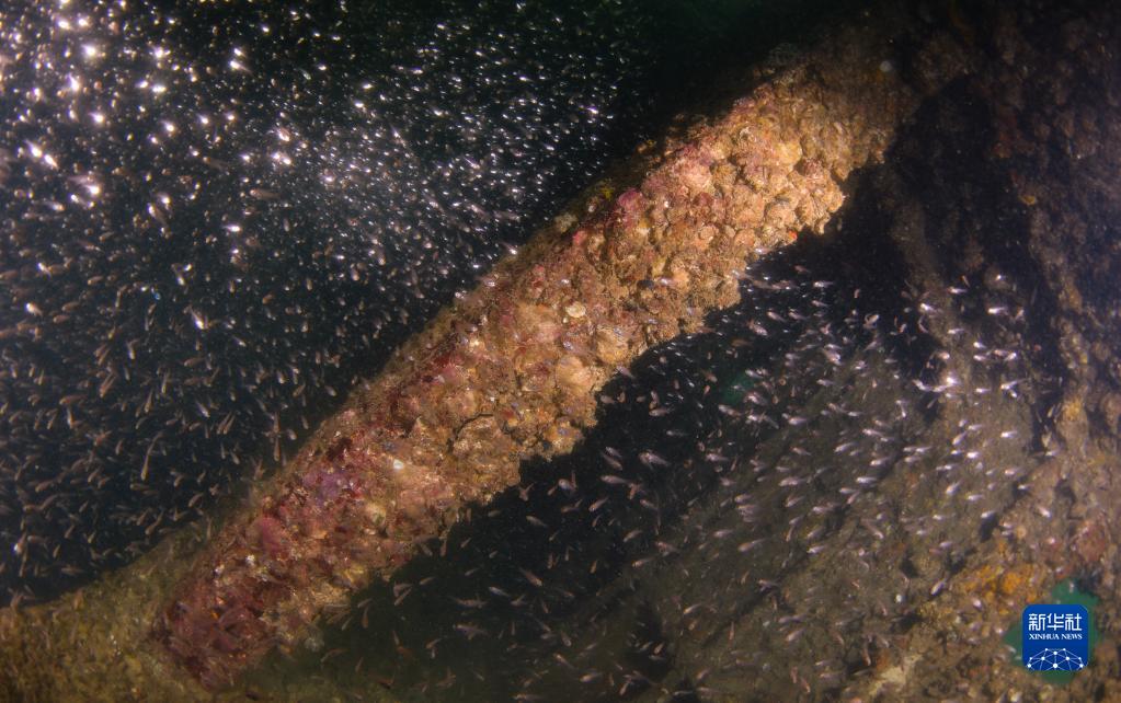 這是在蜈支洲島海域海洋牧場(chǎng)沉船魚(yú)礁內拍攝的魚(yú)群(5月16日攝)。