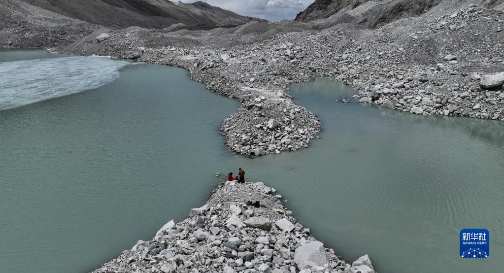 在珠峰海拔約5300米處的冰前湖,科考隊員在取水樣(5月12日攝,無(wú)人機照片)。