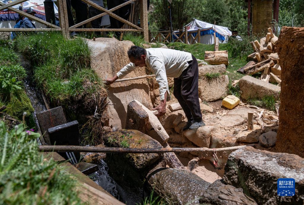 在西藏尼木縣吞巴鎮吞達村,次仁多吉在啟動(dòng)水磨,將作為原料的柏木碾成木漿(6月9日攝)。