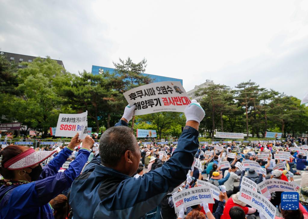 6月12日,民眾在韓國首爾手舉標語(yǔ)牌參加集會(huì ),反對日本核污染水排海。