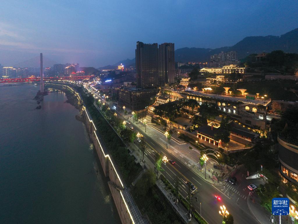 6月9日拍攝的重慶南岸區南濱路上的重慶開(kāi)埠遺址公園夜景(無(wú)人機照片)。