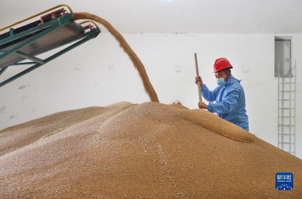 6月13日,在江蘇連云港市青口鹽場(chǎng)倉儲中心,工人用傳輸機傳送烘干后的小麥入庫。