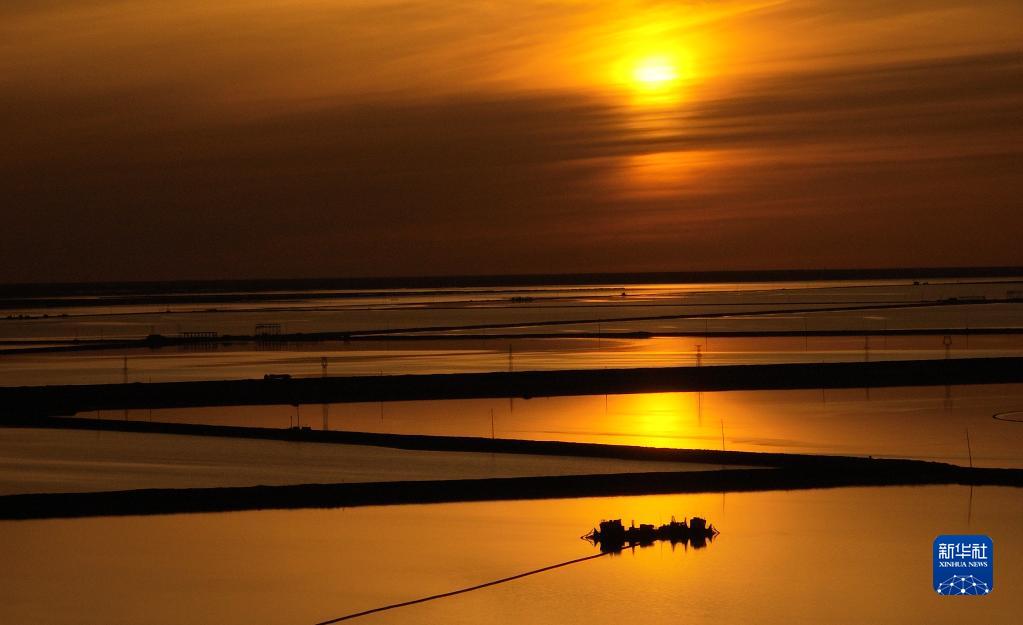 這是6月8日在察爾汗鹽湖拍攝的一艘采鹽船(無(wú)人機照片)。