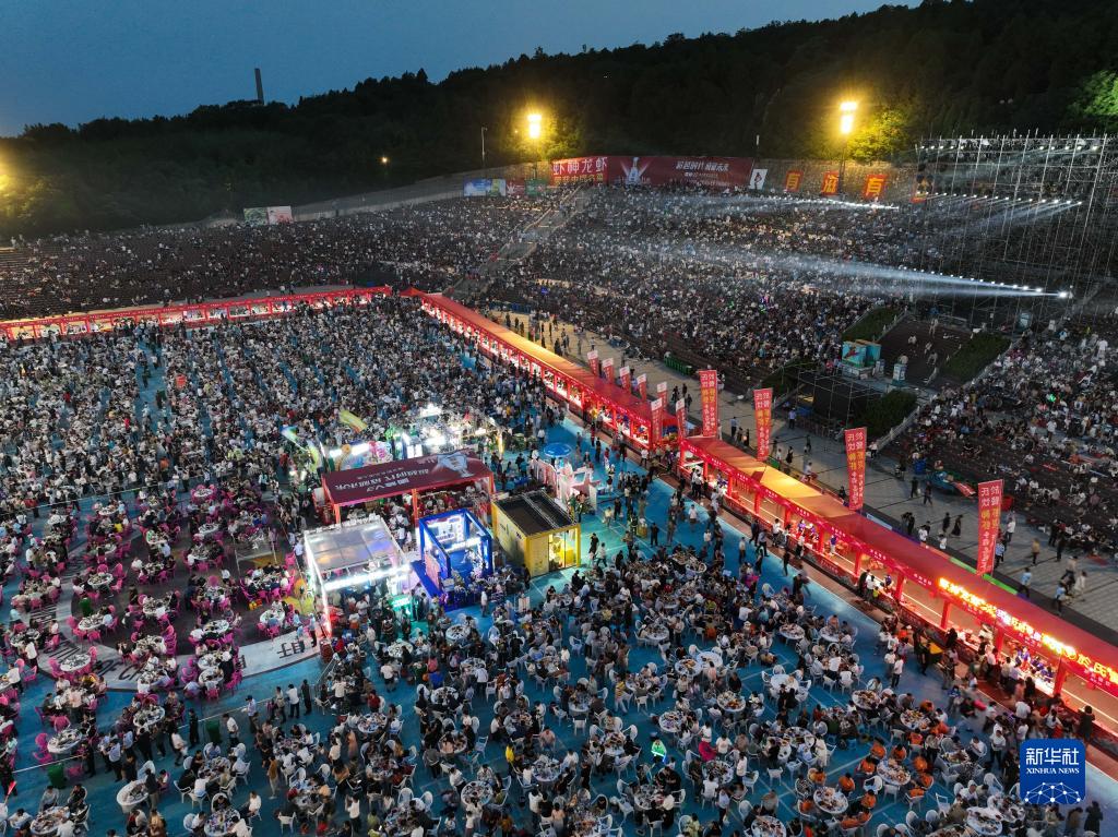 市民和游客參加萬(wàn)人龍蝦宴(6月13日攝,無(wú)人機照片)。