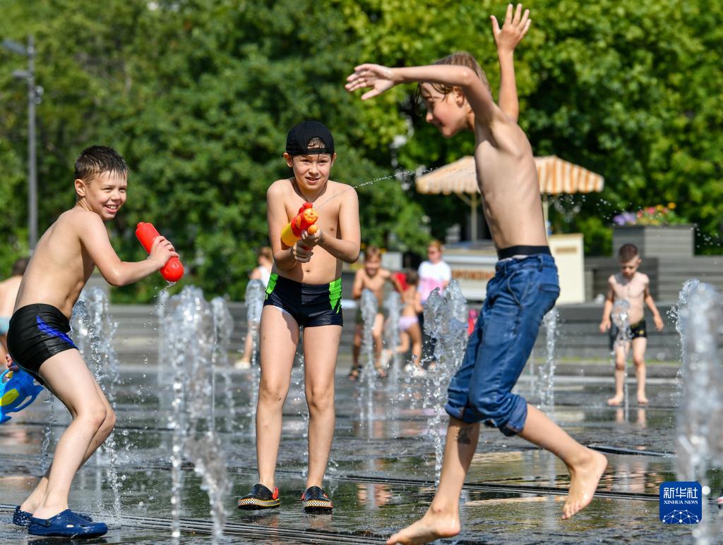 7月6日,在俄羅斯首都莫斯科,兒童在噴泉中玩耍消暑。