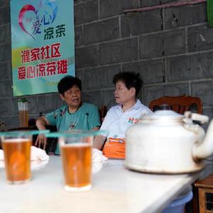 7月7日,社區居民(左)在杭州市濮家聯(lián)合社區愛(ài)心涼茶攤喝涼茶。