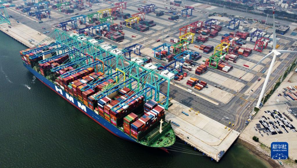 7月7日,一艘貨輪??吭谔旖蚋邸爸腔哿闾肌贝a頭(無(wú)人機照片)。