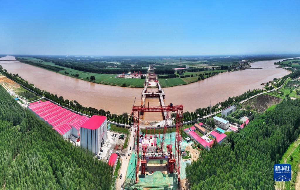 7月7日,在濟濱高鐵濟陽(yáng)黃河公鐵兩用特大橋建設現場(chǎng),中鐵大橋局的施工人員在架設鋼桁梁(無(wú)人機照片)。