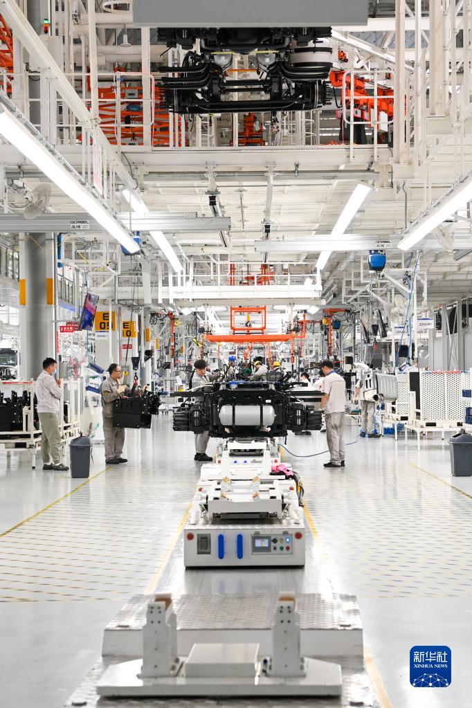 在位于吉林長(cháng)春的一汽解放J7智能工廠(chǎng)內,工人在生產(chǎn)線(xiàn)上裝配車(chē)輛(6月12日攝)。