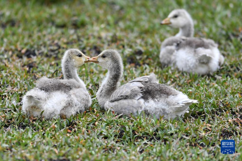 斑頭雁幼鳥(niǎo)在尕海濕地嬉戲(7月7日攝)。