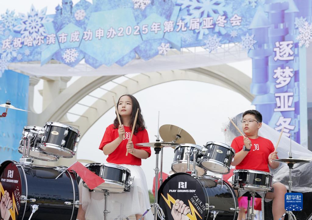 7月8日,在哈爾濱市太陽(yáng)島景區太陽(yáng)石廣場(chǎng),演職人員在慶祝儀式上表演。