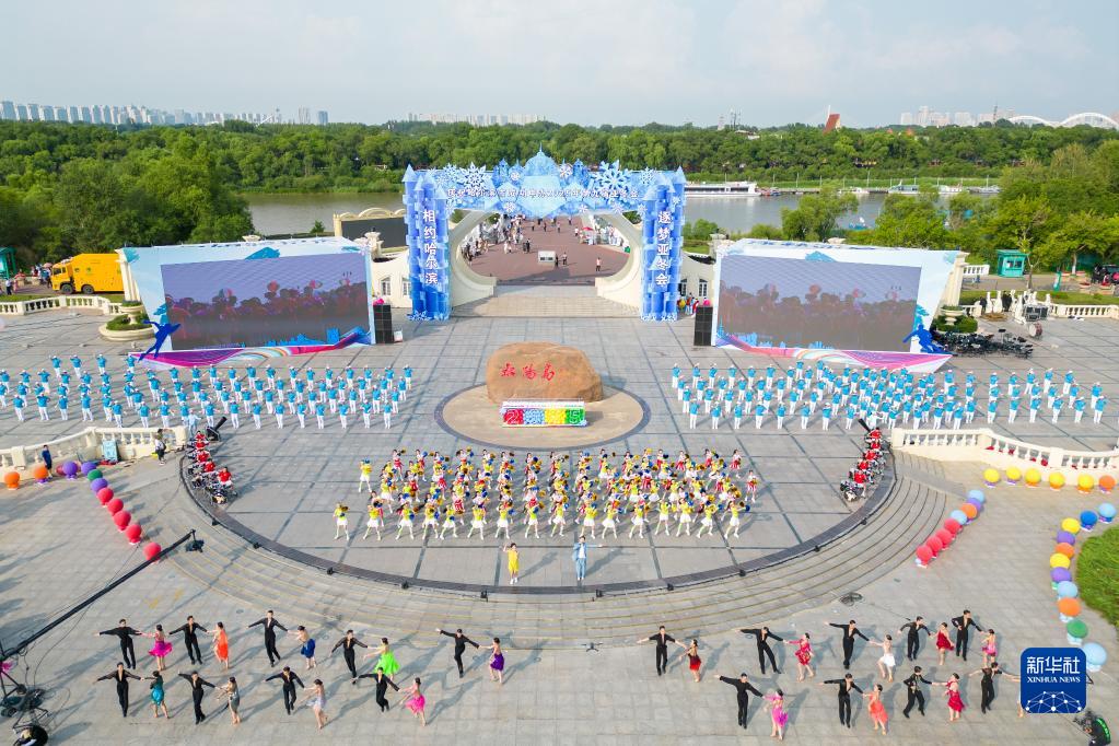 這是7月8日拍攝的在哈爾濱市太陽(yáng)島景區太陽(yáng)石廣場(chǎng)舉行的慶祝儀式現場(chǎng)(無(wú)人機照片)。