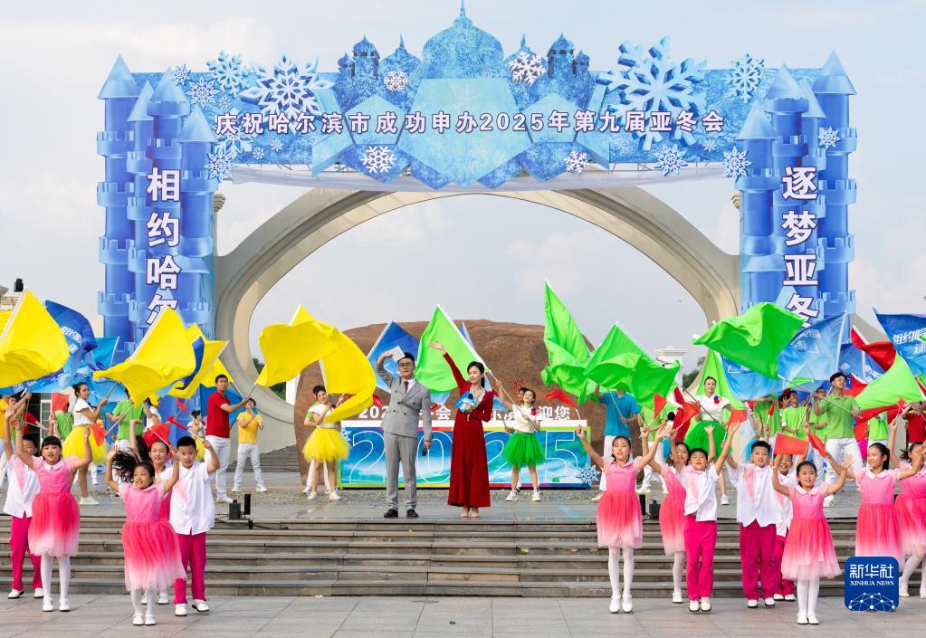 7月8日,在哈爾濱市太陽(yáng)島景區太陽(yáng)石廣場(chǎng),人們慶祝哈爾濱市獲得2025年第九屆亞洲冬季運動(dòng)會(huì )舉辦權。
