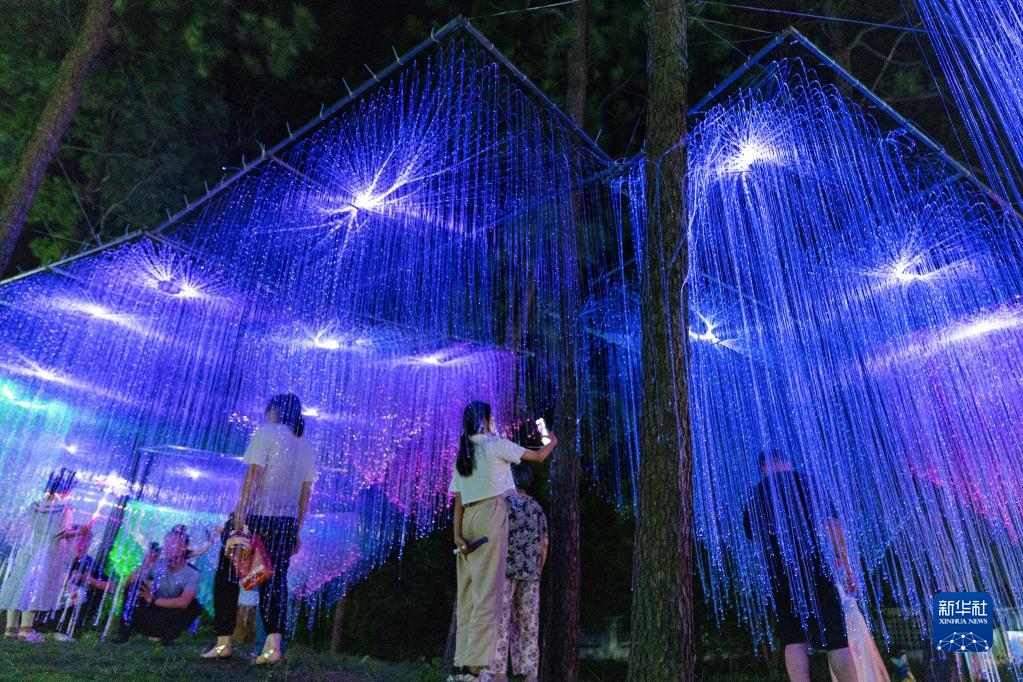 7月8日晚,安徽省合肥市肥東縣橋頭集鎮歡樂(lè )森林景區,人們在欣賞燈展。