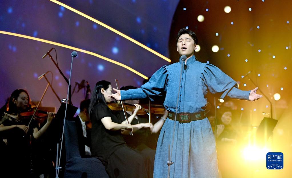 7月8日,在西安“感悟初心?與黨同行”經(jīng)典歌曲交響音樂(lè )會(huì )現場(chǎng),演唱者傲日其愣在演唱歌曲《天邊》。