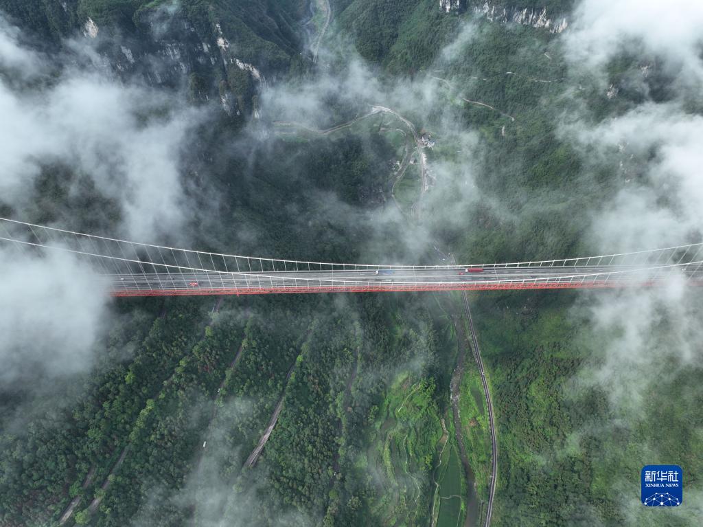 7月8日,雨過(guò)天晴后的湖南省湘西土家族苗族自治州吉首市矮寨特大懸索橋和矮寨盤(pán)山公路云霧繚繞,景色秀美。