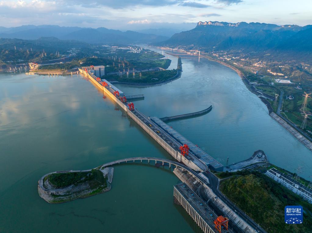 這是7月9日在湖北省宜昌市拍攝的夕陽(yáng)映照下的三峽水利樞紐工程(無(wú)人機照片)。
