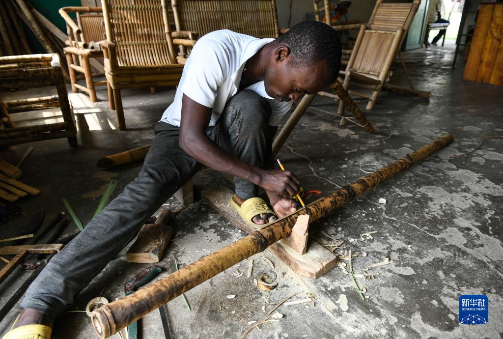 6月21日,在位于布隆迪經(jīng)濟首都布瓊布拉的卡蒙蓋手工業(yè)培訓中心,學(xué)員在生產(chǎn)車(chē)間制作竹家具。