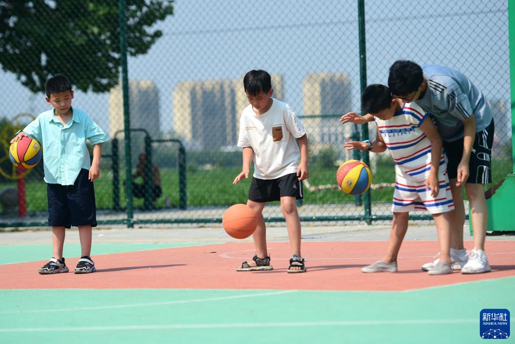 7月10日,在河北滄州,志愿者周義帛(右一)教建設大街社區的孩子打籃球。