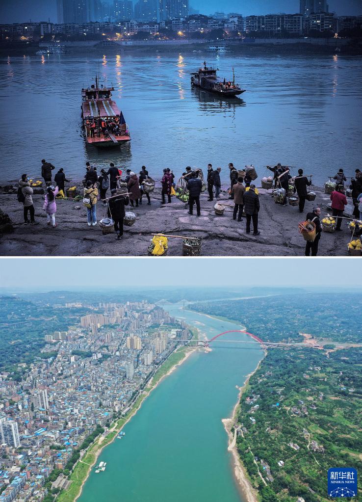 拼版照片:上圖為2021年1月27日清晨,人們在瀘州市合江縣棗林橋渡口碼頭等待乘船過(guò)江(曹衛兵攝);下圖為2023年6月27日拍攝的瀘州市合江縣城及合江長(cháng)江公路大橋(無(wú)人機照片,新華社記者劉坤攝)。