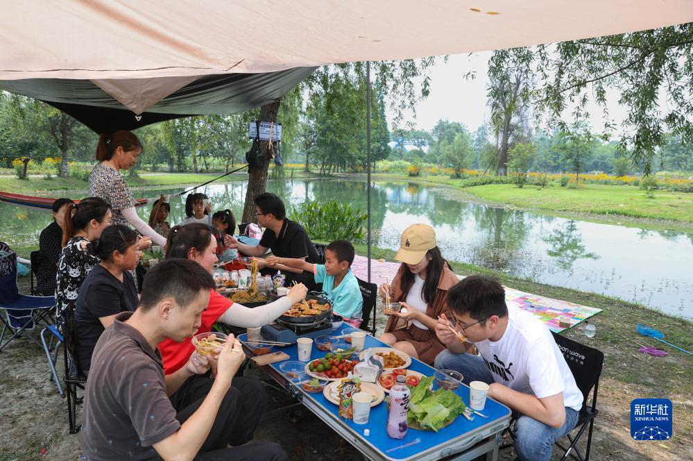 在成都市郫都區三道堰徐堰河濕地公園里,余志朋(右一)約著(zhù)三家親友休閑露營(yíng)(6月23日攝)。徐堰河是錦江主要支流之一。