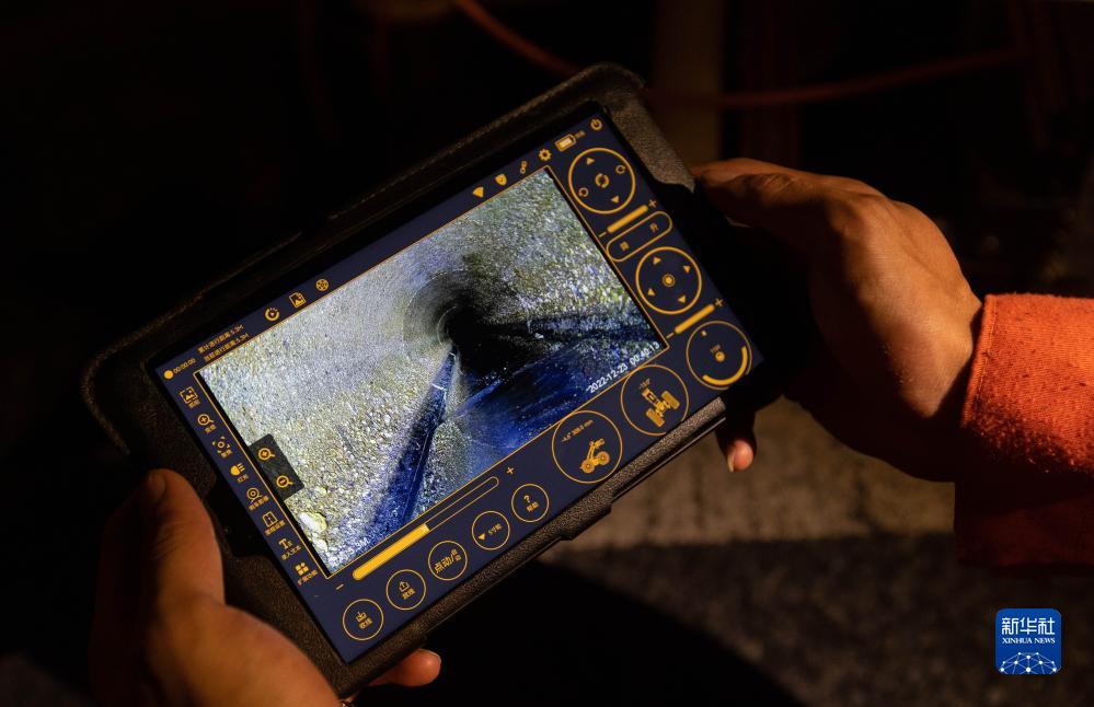 在成都市高新區天府二街,工作人員正操控一臺管道檢測機器人在排水管道里工作(6月16日攝)。新華社記者 江宏景攝