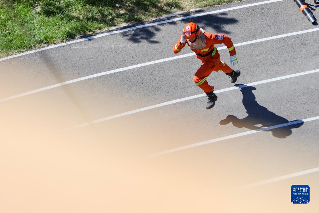 7月13日,一名消防員在專(zhuān)業(yè)技能大比武中向下一個(gè)目標點(diǎn)沖刺。