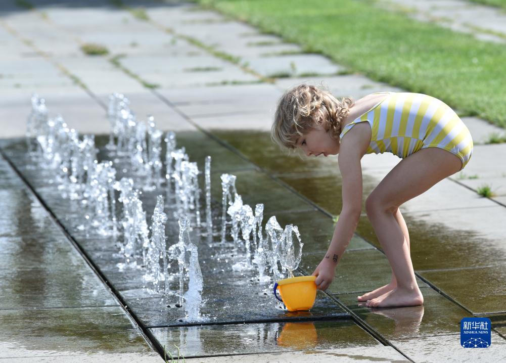 7月13日,小朋友在德國柏林一處噴泉親水納涼。