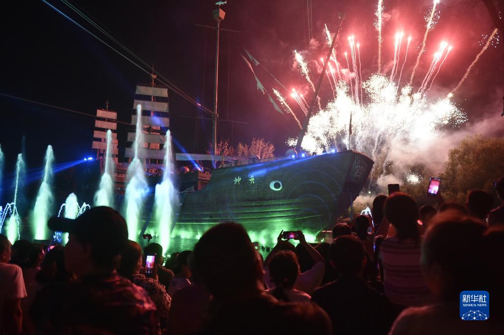 7月13日晚,游客在開(kāi)封市萬(wàn)歲山大宋武俠城景區內觀(guān)賞戶(hù)外實(shí)景表演。