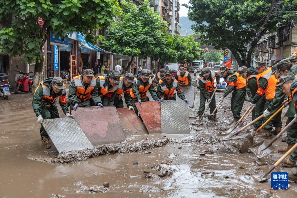 7月14日,在重慶市萬(wàn)州區五橋街道五間橋社區,武警重慶總隊船艇支隊官兵在洪水退去后清淤。
