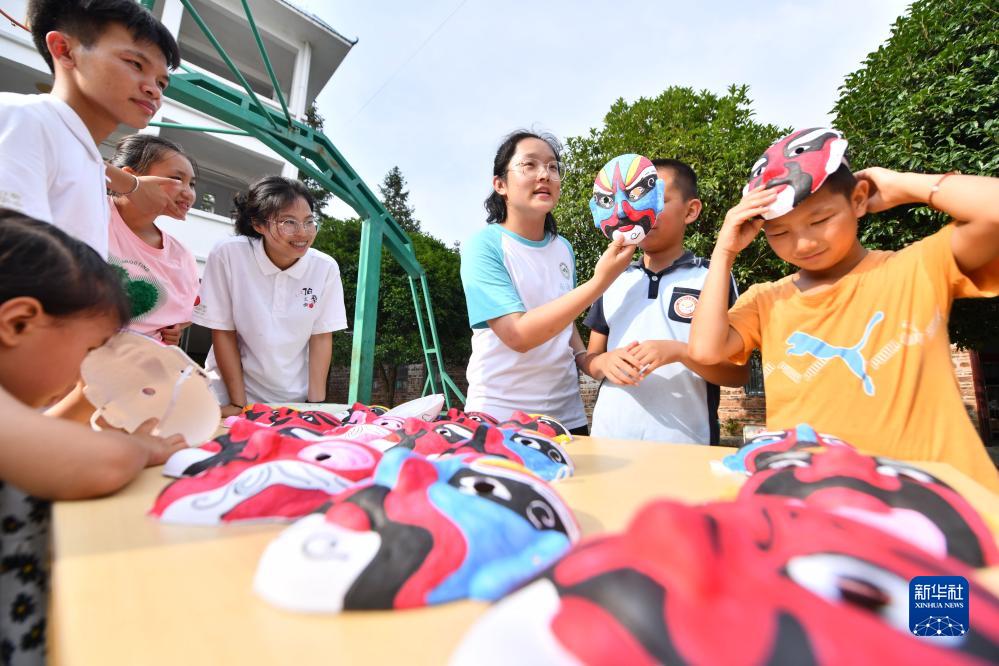 7月14日,在三江侗族自治縣知了小學(xué),孩子們在展示自己的臉譜作品。