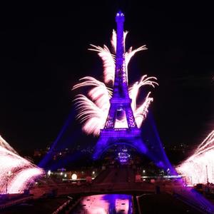 7月14日,焰火在法國巴黎埃菲爾鐵塔周?chē)`放。